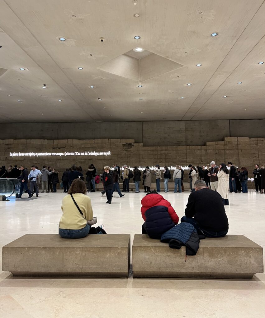 Vendredi 13 mars, dernier jour de campagne. Dehors il pleut, mais les passagers de la dernière rame de la ligne 1 s’en moquent. Ils sont bercés par un trompettiste qui revisite la chanson « Histoire d’un amour » de Dalida. Une classe d’enfants chante à tue-tête. Une dame porte fièrement un béret rouge. Palais Royal-Musée du Louvre, tout le monde descend. Il est temps pour la foule, de s’engouffrer dans l’étroit escalier qui mène directement au musée. Un magasin Relay nous accueille : une vitrine remplie des peluches XXL Ratatouille, le célèbre dessin animé du petit rat parisien. Le couloir du métro nous mène directement dans le musée. Ils appellent cela le « Carrousel du Louvre ». Et déjà se dessine une ligne immense pour entrer dans le musée le plus visité au monde. Rien n’arrête les touristes, même pas la pluie qui est battante aujourd’hui. Ponchos colorés et parapluies en pagaille, les touristes toujours au rendez-vous pour afficher leur ferveur pour la Ville Lumière.