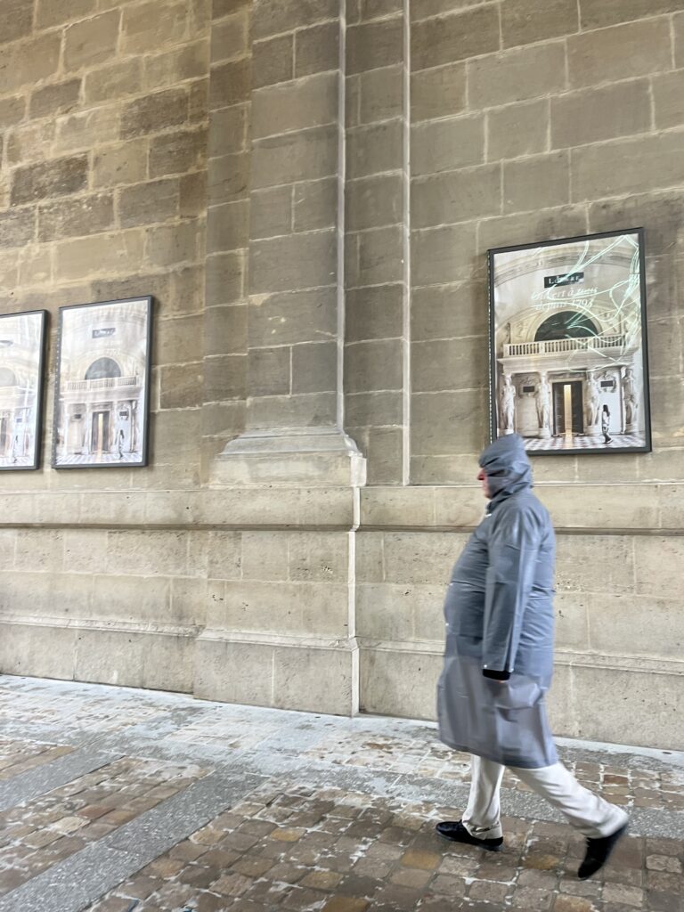 Sous le joli porche du musée, nous sommes abrités. En attendant que passe une grosse averse, c’est tout un condensé de touristes qui est joyeux. De l’autre côté de la rue, dans les boutiques touristiques sous les arcades de la rue de Rivoli, les touristes se bousculent, ils prennent des photos. Tous veulent le poncho coloré Paris avec la Tour Eiffel dessus. Il ne faudrait pas passer à côté de cela. La pluie ne cesse pas, la vendeuse annonce le prix des ponchos : « Les ponchos c’est dix euros et les deux pour quinze. » Difficile de résister.